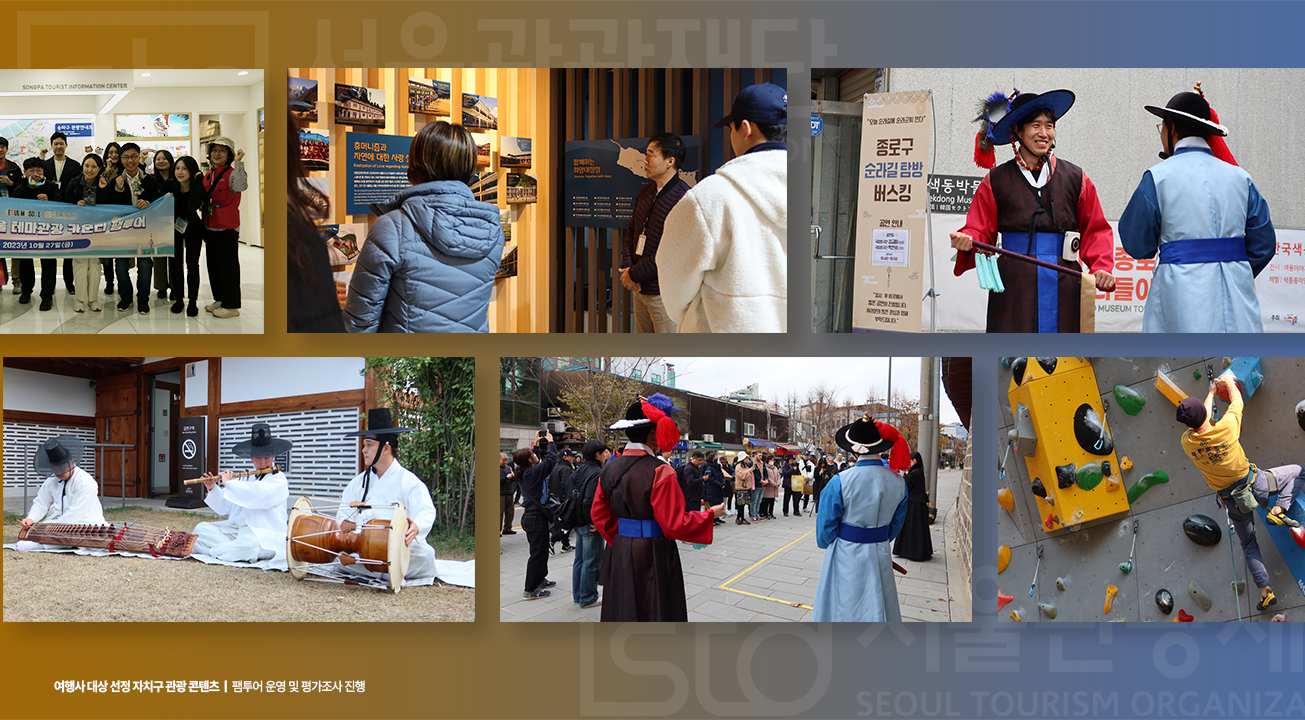 강남(K-컬처), 송파(도심 속 힐링), 강북(산악문화), 종로(순라길 스토리텔링) 등 5개 자치구를 선정하여 특색 있는 테마 관광 코스를 개발하였으며, 주요 여행사 및 미디어 관계자를 초청한 팸투어를 진행하여 실제 여행 상품화 및 국내외 홍보 확산에 기여했습니다.