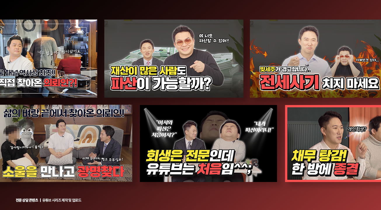 「법무법인소울 온라인 홍보 운영 대행 용역」은 유튜브 채널 생성 및 운영, 브랜딩, 댓글 응대, 디자인 작업물 제작 등을 통해 법무법인을 효과적으로 홍보하는 사업입니다. 동영상 및 쇼츠를 제작 및 업로드하여 이를 통해 법무법인의 브랜드 이미지 강화 및 온라인 채널 활성화에 기여하였습니다.